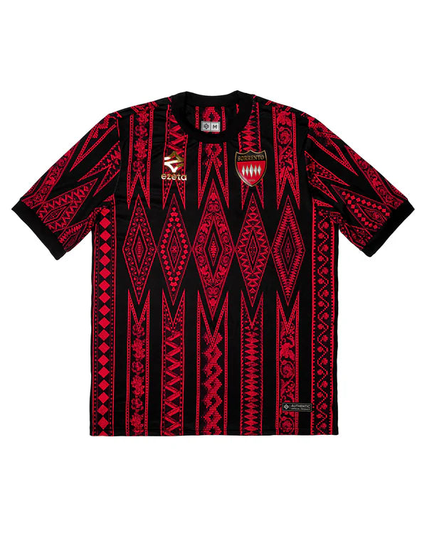 Dieses wunderschöne 25/26 Heim-Trikot vom italienischen Verein Sorrento 1945 ist ist eine Hommage an die alte Kunst der sorrentinischen Intarsienarbeit. Seine dekorativen Muster sind von einem eleganten und raffinierten Schreibtisch aus dem frühen 20. Jahrhundert inspiriert, der im Museum Correale in Sorrent aufbewahrt wird.